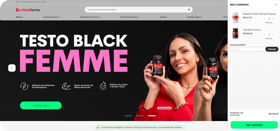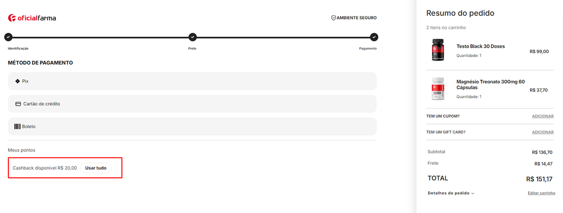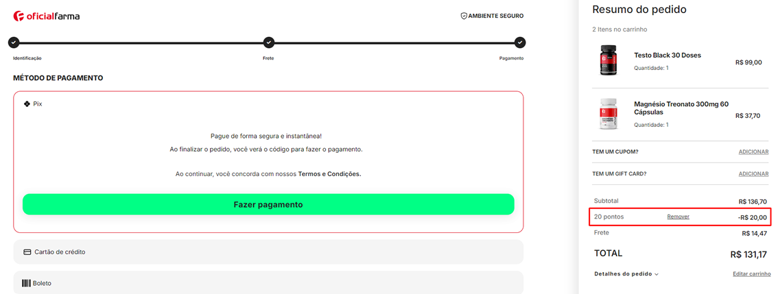 4 - Selecione a forma de pagamento (cartão, boleto, transferência) confira o desconto no resumo do pedido e finalize a compra.